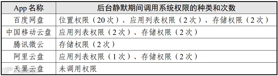 (4)在后台静默场景中,调用系统权限种类和次数最多的为百度网盘(3类,24次)。具体情况如表5。