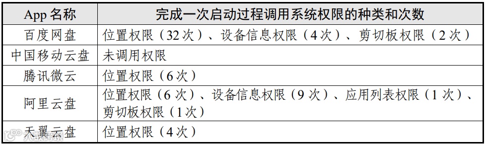(1)在启动App场景中,调用系统权限种类最多的为阿里云盘(4类),调用系统权限次数最多的为百度网盘(38次)。具体情况如表2。