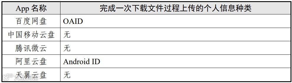 (3)在下载文件场景中,个人信息上传种类最多的为百度网盘和阿里云盘(均为1类)。具体情况如表8。