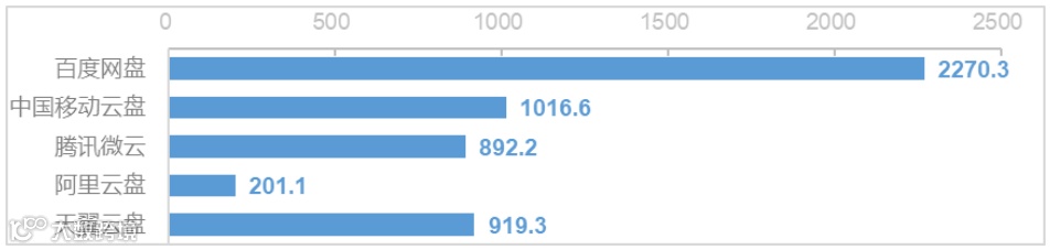 (1)5款App在用户完成一次云盘文件传输活动(启动App、上传文件、下载文件)时,上传数据流量平均⁽³⁾最多的为百度网盘,约为2270KB;平均最少的为阿里云盘,约为201KB。具体情况如图1。