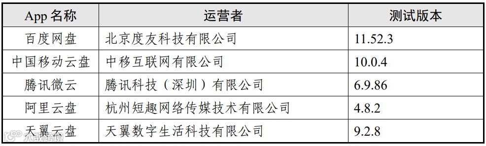 本次测试选取了19家应用商店⁽¹⁾累计下载量达到1亿次的“云盘类”App,共计5款,其基本情况如表1。