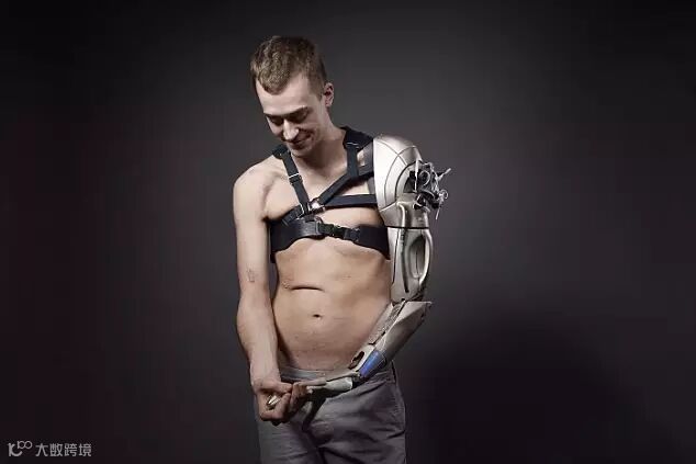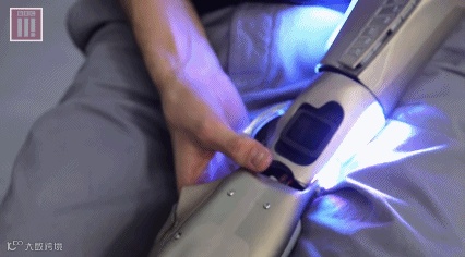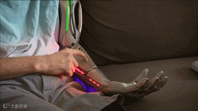 仿生手臂中的传感器紧贴他的肩膀,肩膀末端的肌电传感器能感知肩膀肌肉和神经的指令,机械臂就能直接根据这些指令进行相应的运动。
