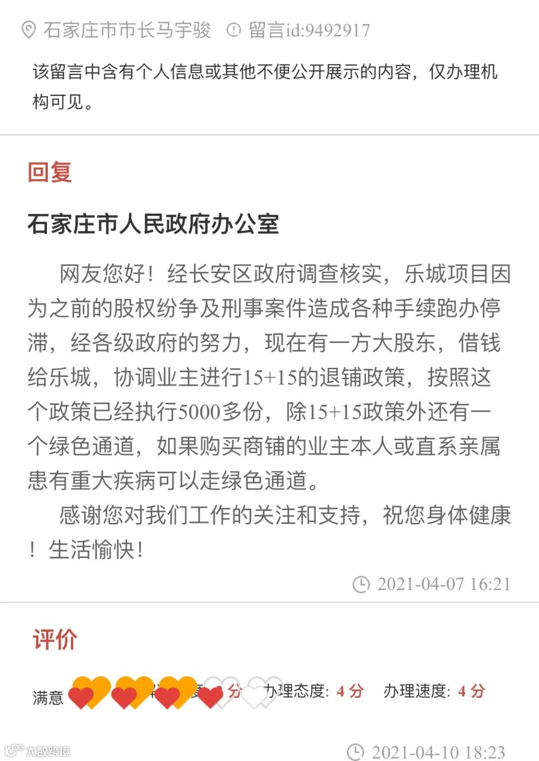 我们的退铺工作一直都是在政府的督导下进行的。近日有业主在人民网“领导留言板”发布过退铺诉求,石家庄市人民政府办公室马宇骏市长在4月7日有相关回复,回复原文如下:网友您好!经长安区政府调查核实,乐城项目因为之前的股权纷争及刑事案件造成各种手续跑办停滞,经各级政府的努力,现在有一方大股东,借钱给乐城,协调业主进行15+15的退铺政策,按照这个政策已经执行5000多份,除15+15政策外还有一个绿色通道,如果购买商铺的业主本人或直系亲属患有重大疾病可以走绿色通道。