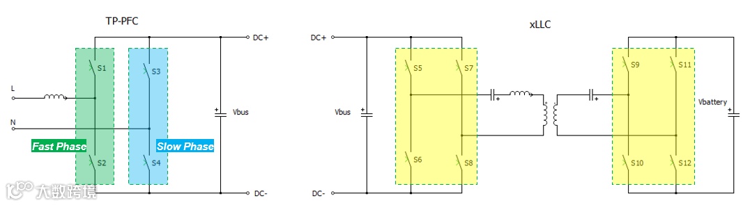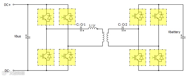 目前最广泛使用的单级OBC拓扑由图腾柱PFC+xLLC(或DAB)两级组成,如图1所示。其中图腾柱PFC,它由一个高速半桥和一个工频整流半桥组成,完成电网要求的功率因素校正功能及后级需要的DC电压调整;DC/DC变换器一般由隔离变压器及其原副边的两个全桥组成,完成PFC级输出电压和高压电池电压间的匹配。