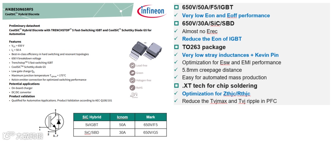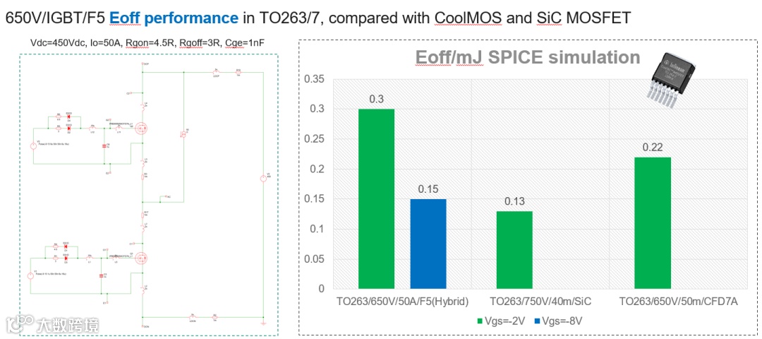 目前车规级Hybrid产品组合有两款产品,AIKW50N65RF5和 AIKBE50N65RF5,分别是TO247-3和TO263-7两种不同封装形式的产品。两者电气特性差异主要体现在二极管电流和热阻值,如图3所示。IGBT F5具有非常低的开关损耗Eon和Eoff;SiC/SBD G6几乎没有反向恢复Erec,进一步减少了IGBT的Eon。TO263封装具有开尔文Source脚,引脚寄生电感进一步降低,进一步优化了开关损耗Esw,电磁EMI性能也更加友好。