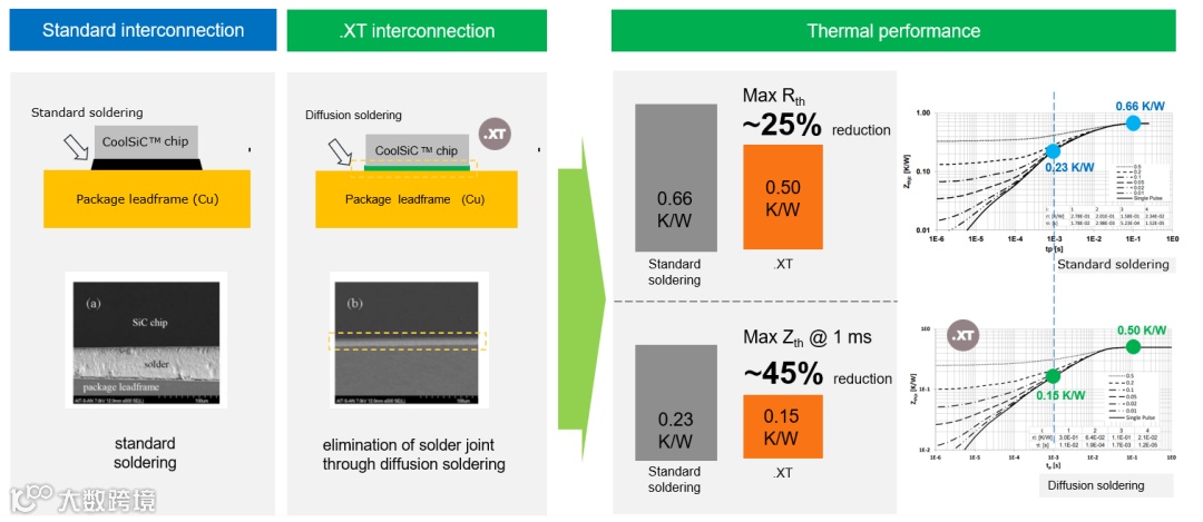 XT技术消除了通过标准焊接工艺所看到的典型限制。英飞凌率先采用扩散焊接工艺,通过封装从芯片到散热器建立了非常良好的热连接。与CoolSiC™相结合,这可以通过将芯片的散热能力提高30%或将工作温度降低15K,将芯片的结-壳热阻优化25%。还可以实现更高的电流输出和更低的工作温度,这不仅提高了系统输出电流能力,还延长了器件的寿命。AIKBE50N65RF5使用了这项独特扩散焊接工艺,改善了器件的热阻,提高了器件体的性能、可靠性和寿命。下图11对比了扩散焊接和传统软焊接工艺及其带来的热则性能的提升。
