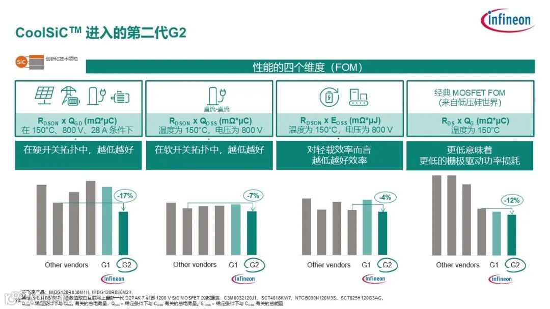 英飞凌已经推出第二代碳化硅MOSFET产品,G2的性能优化改善有四个维度,这一页的数据是以1200V,26和30毫欧为例。
