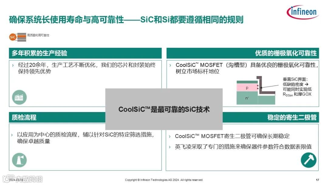 英飞凌CoolSiC™沟槽型MOSFET具备优异的栅极氧化层可靠性,生产工艺和质检流程经过20余年不断优化,让芯片和封装始终保持领先优势,2016年上市8年来质量一直很稳定。