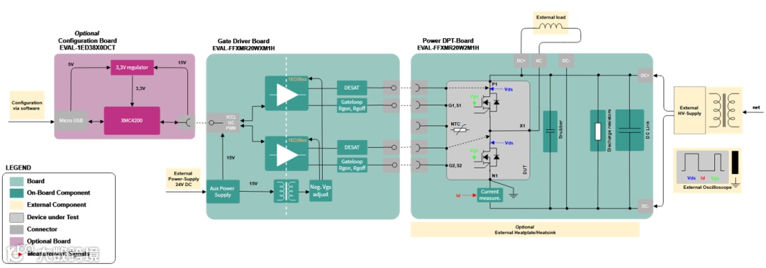 这是一个用于测试半桥配置的2kV CoolSiC™ EasyDUAL™ 2B MOSFET的双脉冲测试评估板。它可以可靠、快速的使用1ED3890MC12M EiceDRIVER™驱动2kV SiC半桥电路。