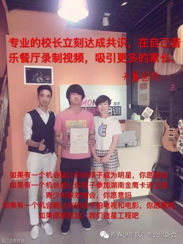 专业的校长立刻达成共识,在自己音乐餐厅录制视频,吸引更多的家长。