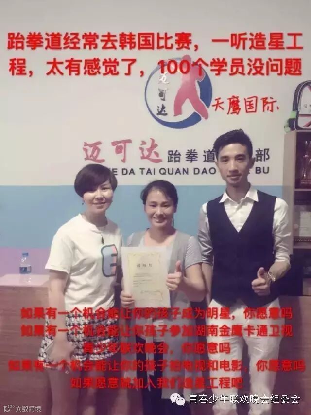 跆拳道经常去韩国比赛,一听造星工程,太有感觉了,100个学员没问题。