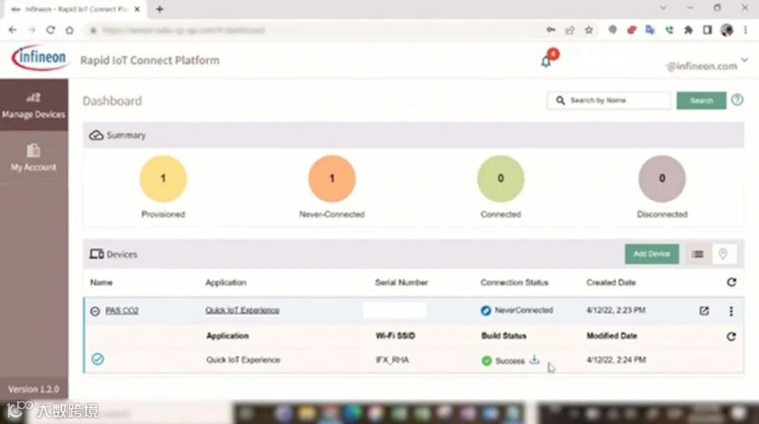登录后,用户可以利用设备的序列号来添加设备。系统将引导您下载并利用预编译的应用程序示例及与云端建立安全连接所需的所有证书来编写开发套件。此时,用户必须提供Wi-Fi网络的接入信息,以使套件能与云端建立连接。完成这些步骤后,云将为您构建一个项目,您可以通过快速IoT连接平台主页的设备选项卡来访问该项目。