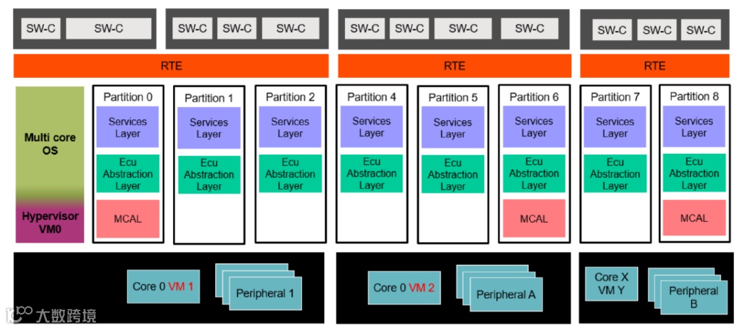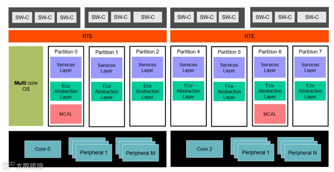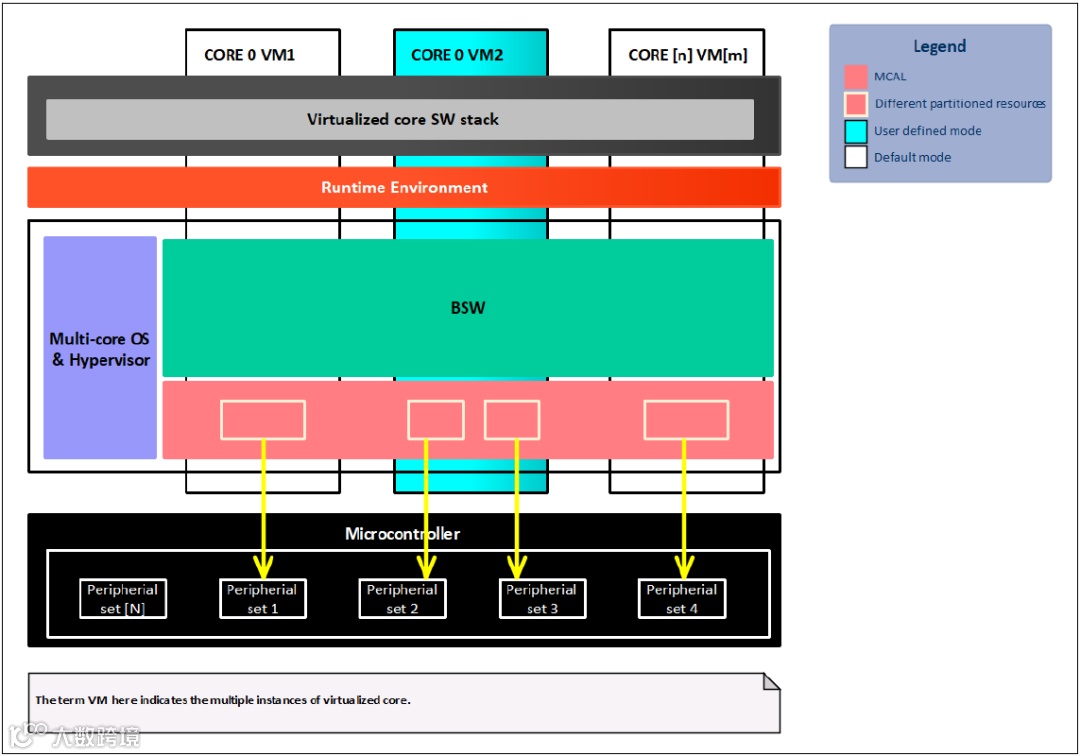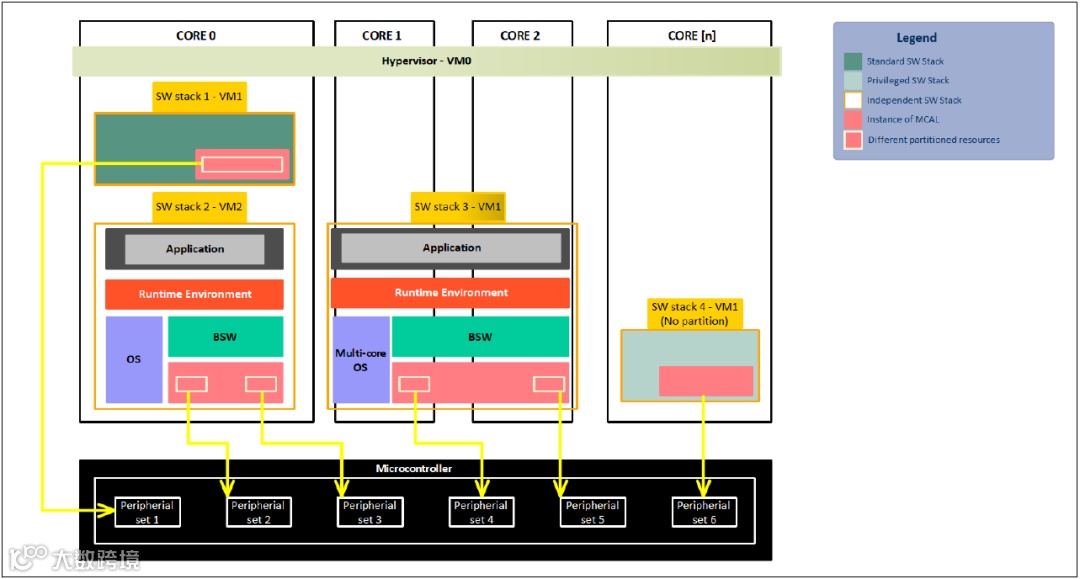 在multi-core应用实例中,software stack工作在多核上,software stack可能在每一个核上都有很多分区,并且为每个分区分配了不同的硬件资源,每个分区可以有不同的ASIL,这是单核实例的扩展,以支持多核系统。