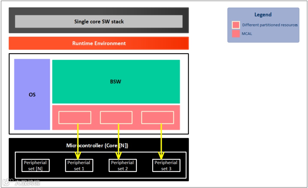 在single core应用实例中,software stack工作在单核上,software stack可以包括多个分区。但是,MCAL软件本身仅支持从单个分区执行。所有驱动程序所需的硬件资源的所有实例都分配给该分区。