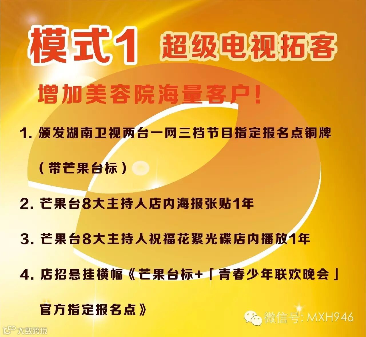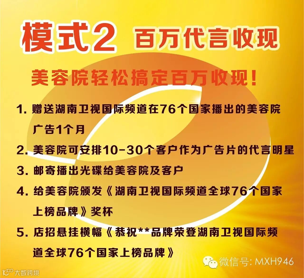 1.赠送湖南卫视国际频道在76个国家播出的美容院广告1个月