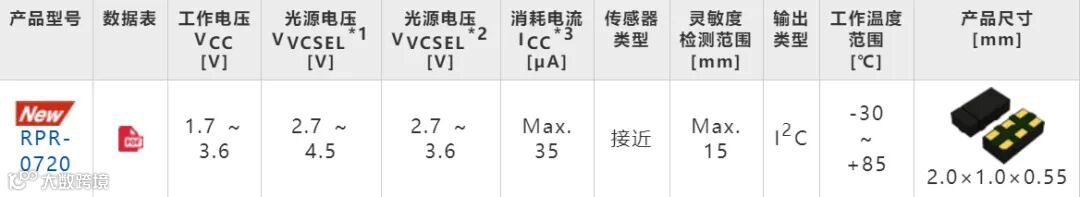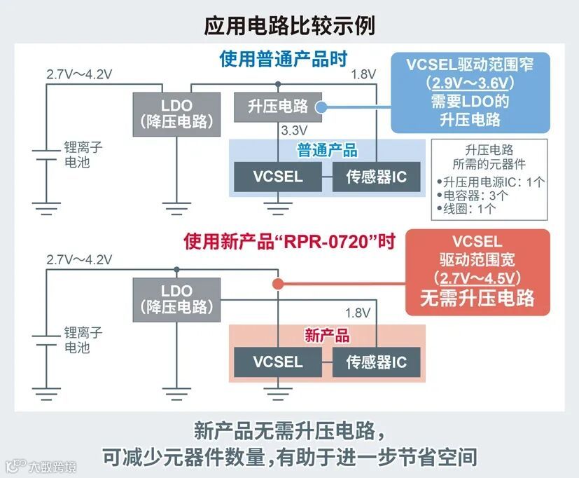 新产品是一款采用光束发散角比LED更窄的VCSEL*作为发光元件、使用传感器IC作为光接收元件的光学传感器模块。通过使用ROHM自产元件优化模块结构,实现了小尺寸,与以往产品相比,产品安装面积削减了约78%。另外,所配备的VCSEL支持2.7V~4.5V的宽输入电压范围,在使用锂离子电池时无需外围升压电路(例如:1个升压电源IC、3个电容器、1个线圈等),有助于应用产品的小型化和确保增加电池容量的空间。这些特点使新产品不仅适用于无线耳机和智能手表等可穿戴设备的脱戴检测应用,还适用于各种应用的各种状态检测应用。