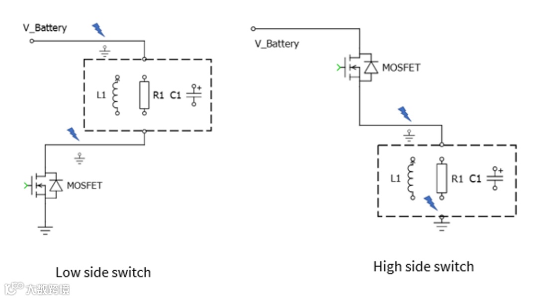 智能功率开关分为智能高边开关和低边开关。顾名思义,高边开关(High side switch)表示功率开关处于负载高电势的一侧,即电池和负载之间。而低边开关(Low side switch)处于负载的低电势一侧,通常是在负载和地之间。