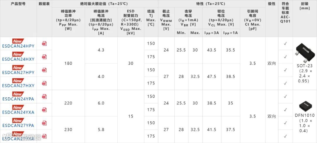 “ESDCANxx系列”有SOT-23(2.9mm×2.4mm)和DFN1010(1.0mm×1.0mm)两种封装,分别支持24V和27V的截止电压(VRWM)。SOT-23封装有支持24V的“ESDCAN24HPY”、“ESDCAN24HXY”和支持27V的“ESDCAN27HPY”、“ESDCAN27HXY”共4款,DFN1010封装有支持24V的“ESDCAN24YPA”、“ESDCAN24YXA”和支持27V的“ESDCAN27YPA”、“ESDCAN27YXA”共4款,两种封装合计8款新产品。