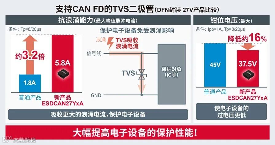 随着自动驾驶技术和ADAS技术的快速发展,对速度更快、可靠性更高的车载通信系统的需求也随之增加。特别是自动驾驶领域,需要快速、准确地处理从摄像头、LiDAR和雷达等的传感器获取的大量信息,因此以往车载通信所用的CAN逐渐被能够更高速、更大容量地传输数据的CAN FD取代。另一方面,要想提高车载通信的速度,就必须实现在严苛环境下的稳定通信,因此对引脚间电容低、抗浪涌和钳位电压等特性优异的保护器件的需求日益高涨。因此,车载通信用TVS二极管市场预计未来将会进一步增长。为了满足这些市场需求,ROHM开发出同时实现了低引脚间电容和出色抗浪涌能力的新产品“ESDCANxx”。