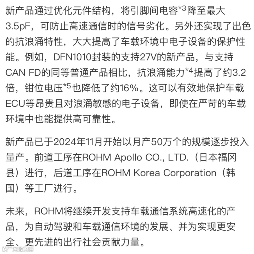 全球知名半导体制造商ROHM(总部位于日本京都市)面向随着自动驾驶和高级驾驶辅助系统(ADAS)的发展而需求不断增长的高速车载通信系统,开发出支持CAN FD(CAN with Flexible Data rate)*1总线端口保护的双向TVS(ESD保护)二极管*2“ESDCANxx系列”。CAN FD是车载ECU(电子控制单元)之间实时且安全的数据收发所必需的通信技术。新产品可在不使CAN FD等高速通信中的传输信号劣化的前提下,保护ECU等电子设备免受浪涌和静电放电(ESD)的影响,从而实现高品质的车载通信。