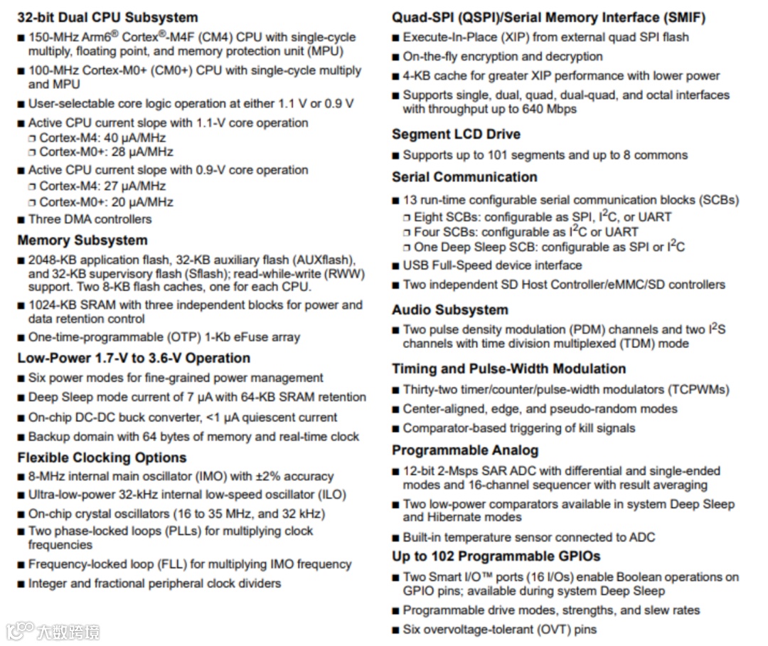 PSoC™ 62 系列是 Arm-Cortex-M4 和 Arm-Cortex-M0 的组合,具有单周期乘法的150-MHz Arm Cortex-M4F CPU(浮点和存储器保护单元),100-MHz Cortex M0+ CPU,带单周期乘法和 MPU,可编程数字和模拟资源以及一流的用于触摸的 CAPSENSE™ 技术。