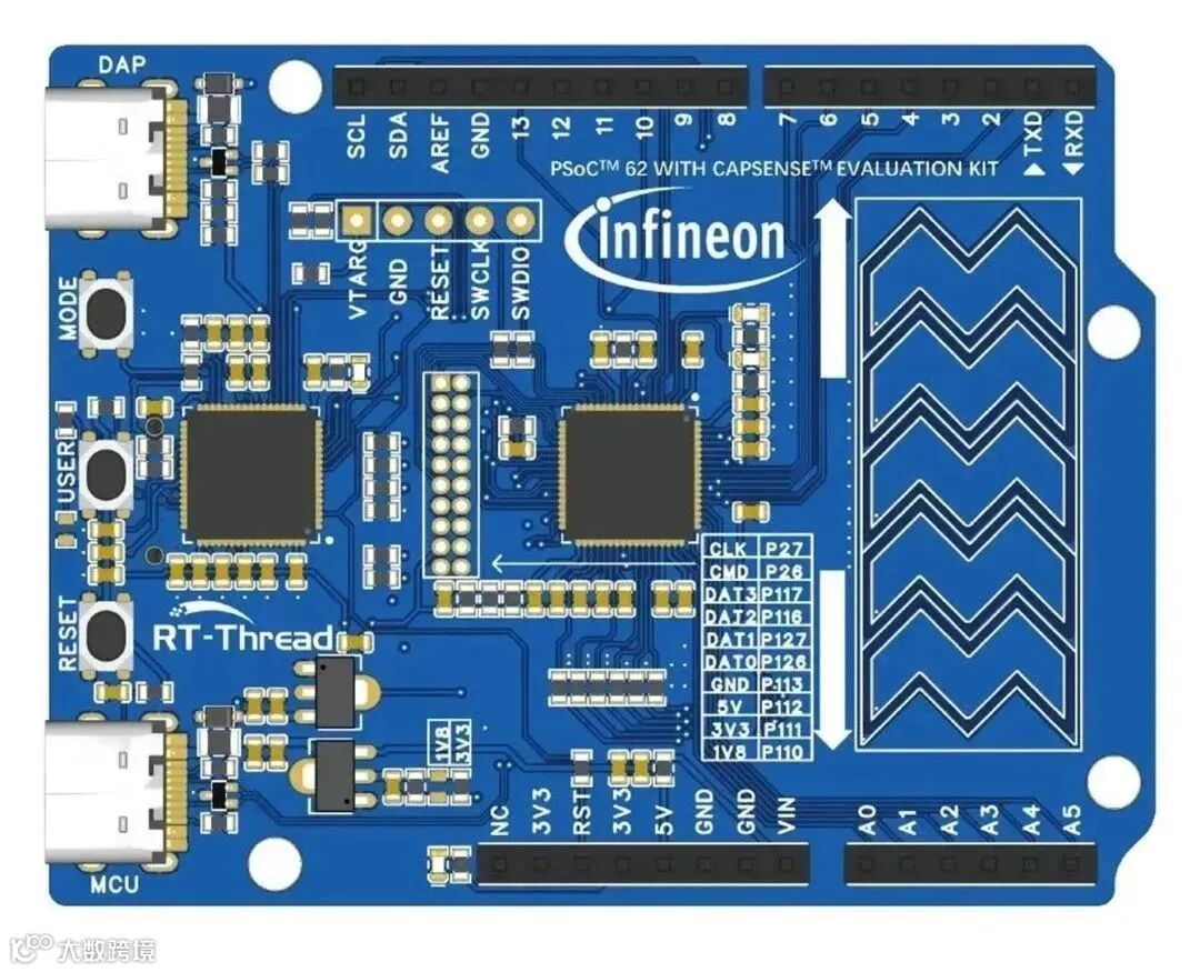 近日,英飞凌联合 RT-Thread 共同发布了PSoC™ 62 with CAPSENSE™ evaluation kit开发板(以下简称PSoC 6 RTT开发板),其默认内置物联网操作系统 RT-Thread。PSoC 6 RTT开发板具有丰富的软硬件资源和低成本优势,兼容 Arduino 接口,助力开发者进行评估以及实现创意开发。