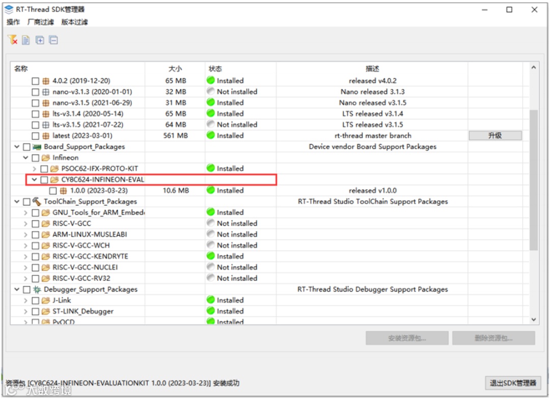 PSoC 6 RTT开发板默认集成 KitProg3-DAP-Link 调试器。KitProg3 是用于编程和调试的通信固件。适用于 ModusToolbox™、PSoC™ 和其他软件生态系统的编程解决方案。
