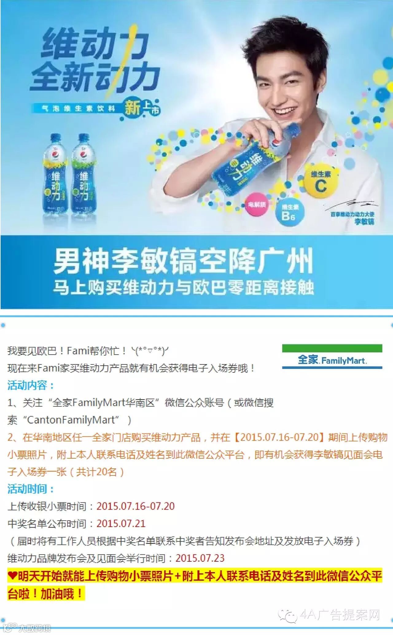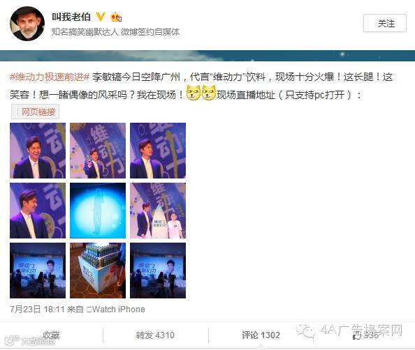 7月23日,百事首款气泡维生素饮料维动力品牌发布会在广州举行,长腿欧巴李敏镐作为动力大使空降现场。作为百事首款气泡维生素饮料,维动力选择活力大男孩、长腿高颜值的李敏镐来代言,完美呈现了产品健康阳光的特性。