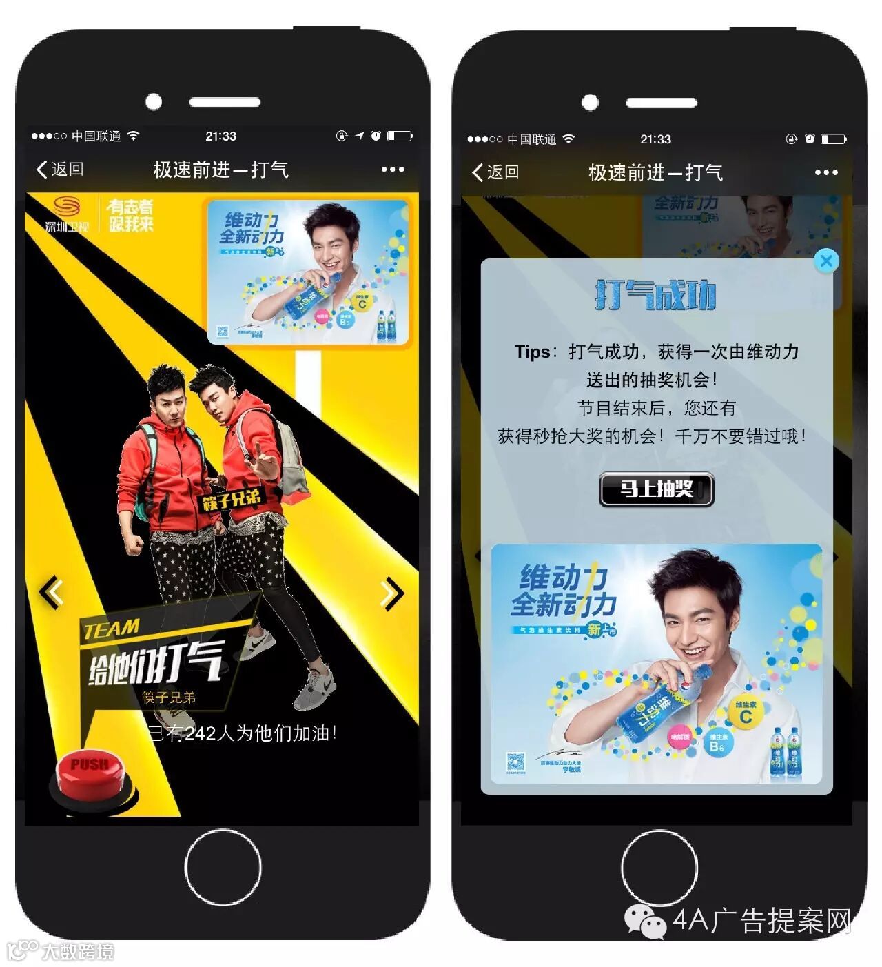 同时,维动力成为竞技类真人秀《极速前进》的顶级合作伙伴,成为节目中竞技明星唯一补给水站。节目采用台网联动,推出为明星打气抽大奖的双屏互动,维动力以品牌发布会与动力大使李敏镐面对面创造吸引力,一方面将卫视的观众,聚拢到品牌的周围,同时也将其他明星的粉丝一同纳入囊中; 另一方面吸引广大观众通过《极速前进》生动的了解维动力饮料,取得了相当不错的宣传效果。