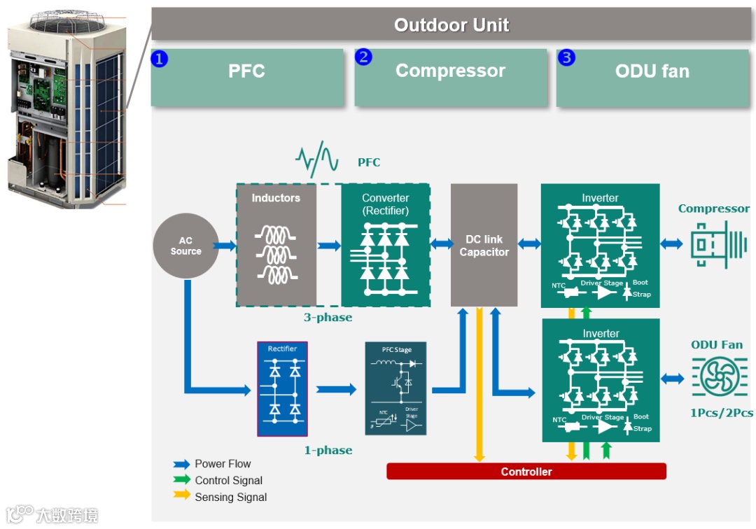 热泵按照交流输入电源可以分为单相热泵和三相热泵,其输出电功率可覆盖3 kW到几十千瓦。如图2所示,热泵的室外机,主要由三部分构成,包含PFC、压缩机逆变器和风机逆变器。