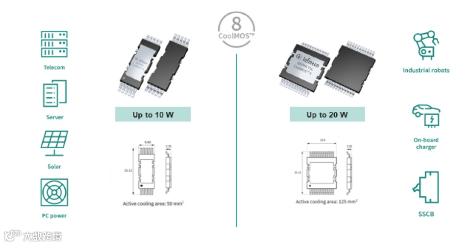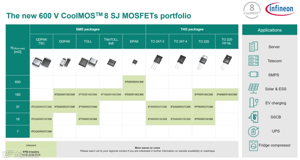 CoolMOS™ 8器件是工业和消费市场中不同SMPS应用的理想选择。但它们仍然尤其适用于数据中心和可再生能源等重要终端市场。在数据中心应用领域,CoolMOS™ 8通过实现利用硅器件可能达到的、尽可能最高的系统级功率密度,来帮助设计人员达成能源效率和总拥有成本目标。在可再生能源应用领域,采用顶部冷却(TSC)封装的CoolMOS™ 8器件,可帮助减小系统尺寸和降低解决方案成本。