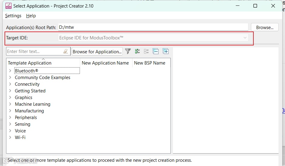 而独立运行Project Creator时,它的行为如图02所示。此时,Target IDE的下拉框是可以选择的,这表示它可把选中的例程生成给指定IDE使用,即生成为该IDE可以打开的工程。这一设计也是自然的,因为此时的Project Creator是独立运行的,所以它并不受制于Eclipse IDE,从而可以为受支持的IDE进行工程的创建。