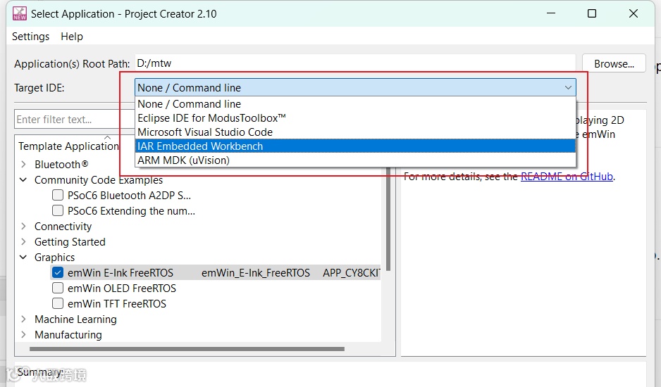 “IAR Embedded Workbench”和“ARM MDK”是常用的导出选项。你甚至可以选择“None / Command line”,即不导出到任何的IDE,而采用更底层的编辑和编译方式。