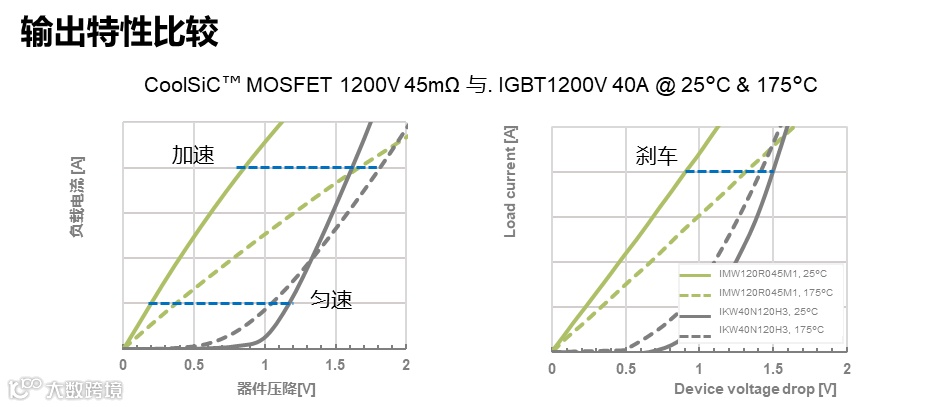 SiC MOSFET导通时没有拐点,很小的VDS电压就能让SiC MOSFET导通,因此在小电流条件下,SiC MOSFET的导通电压远小于IGBT。大电流时IGBT导通损耗更低,这是由于随着器件压降上升,双极性器件IGBT开始导通,由于电导调制效应,电子注入激发更多的空穴,电流迅速上升,输出特性的斜率更陡。对应电机工况,在轻载条件下,SiC MOSFET具有更低的导通损耗。重载或加速条件下,SiC MOSFET导通损耗的优势会有所降低。
