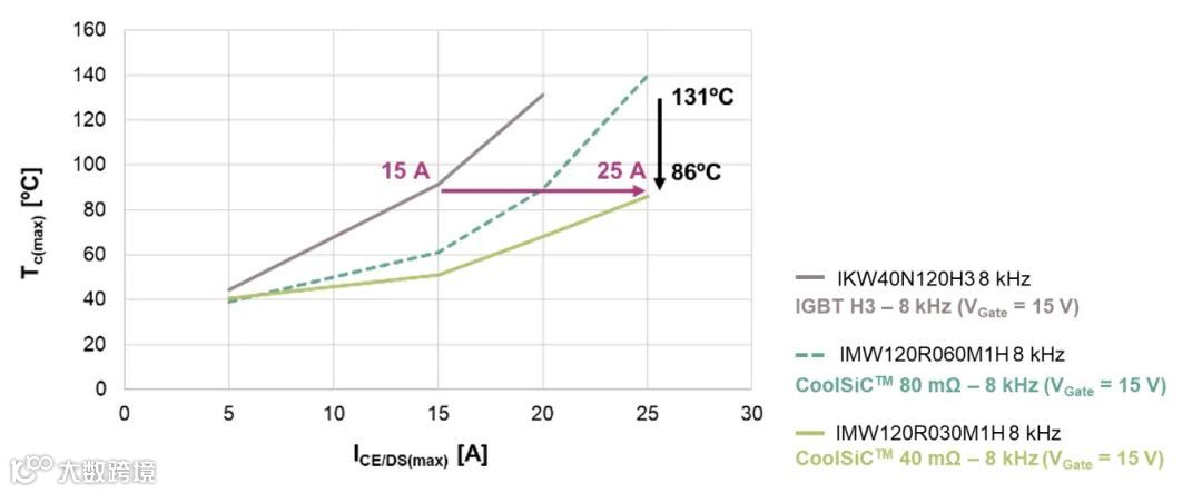 可以看出,基于以上工况,同样的温度条件下,30mohm的器件输出电流比40A IGBT提高了10A,哪怕换成小一档的60mohm SiC MOSFET,输出电流也能提升约5A。而相同电流条件下,SiC MOSFT的温度明显降低。