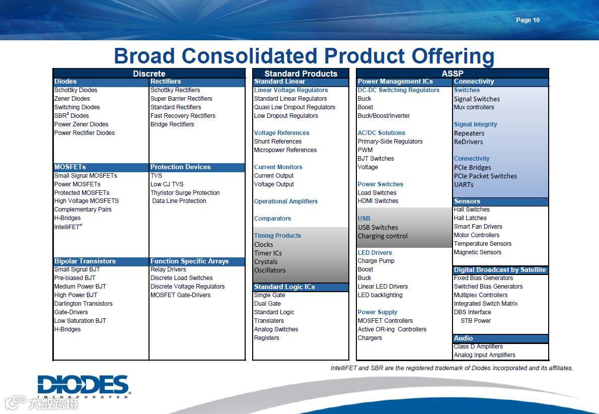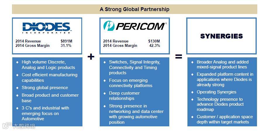 Diodes于2015年正式收购Pericom,增你强Diodes代理线新增三大产品品项销售:链接性产品、讯号完整性产品和频率产品。