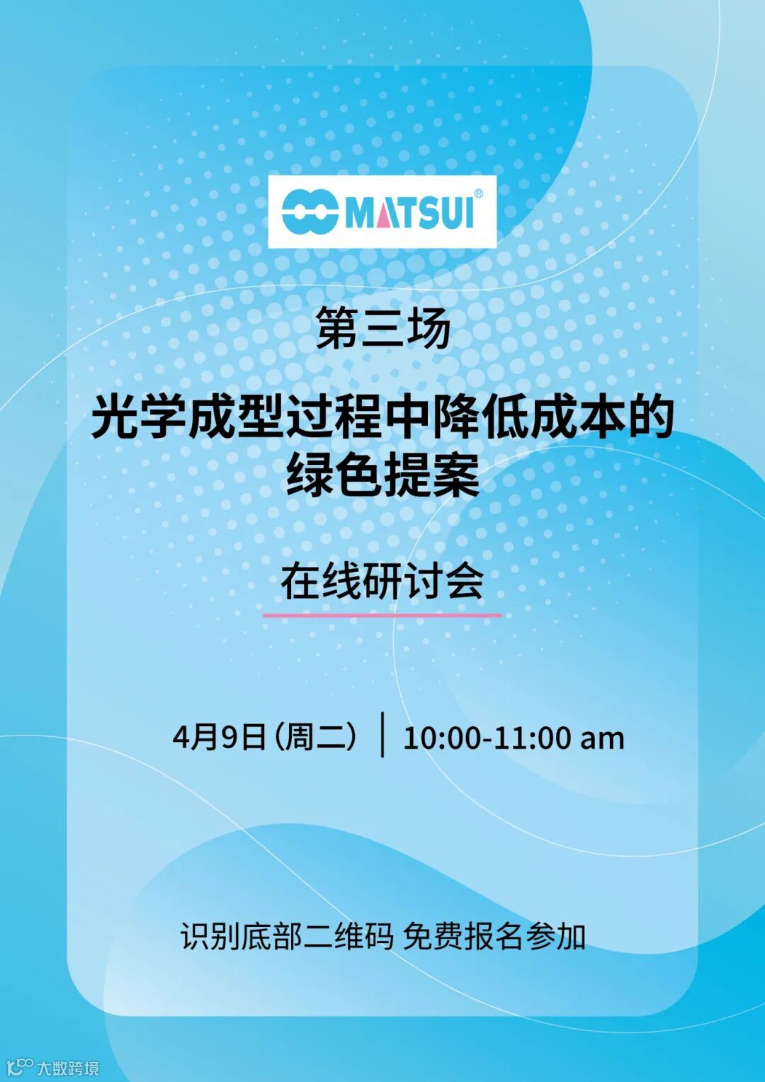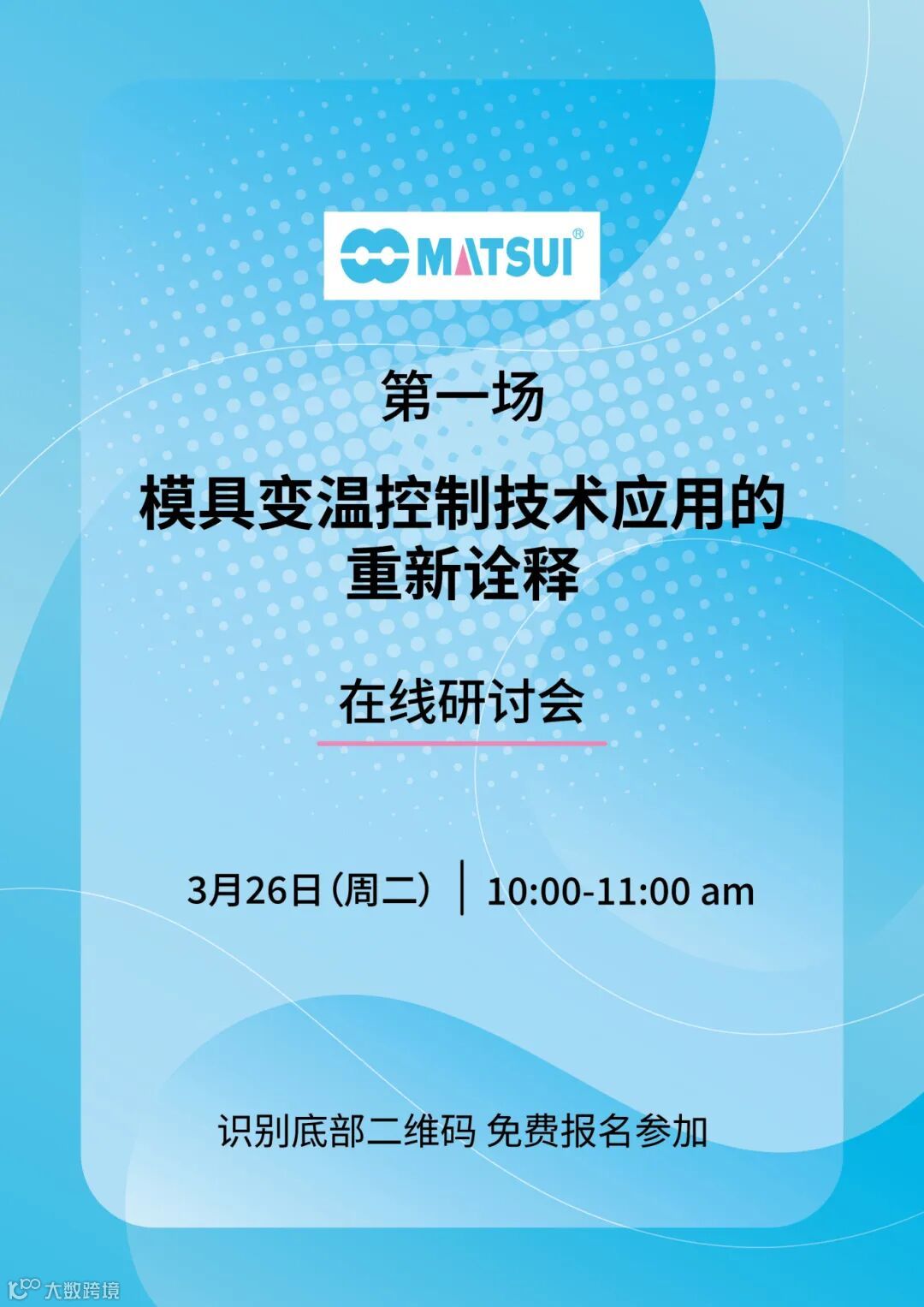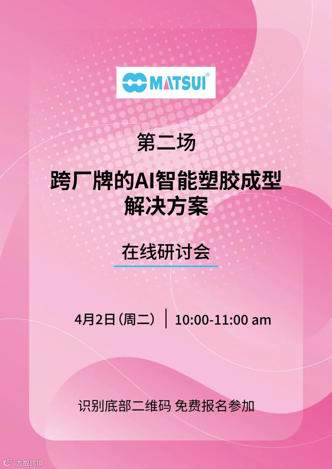 2024年3月26日、4月2日、4月9日上午10:00-11:00共有三场不同主题的在线研讨会,欢迎识别底部二维码报名和选择任意场次,免费参加!在线研讨会的详细方案,将在Chinaplas2024年4月23日(周二)~26日(周五)上海·虹桥·国家会展中心隆重展出,届时欢迎莅临参观松井展台,松井展位号:4.1C66。