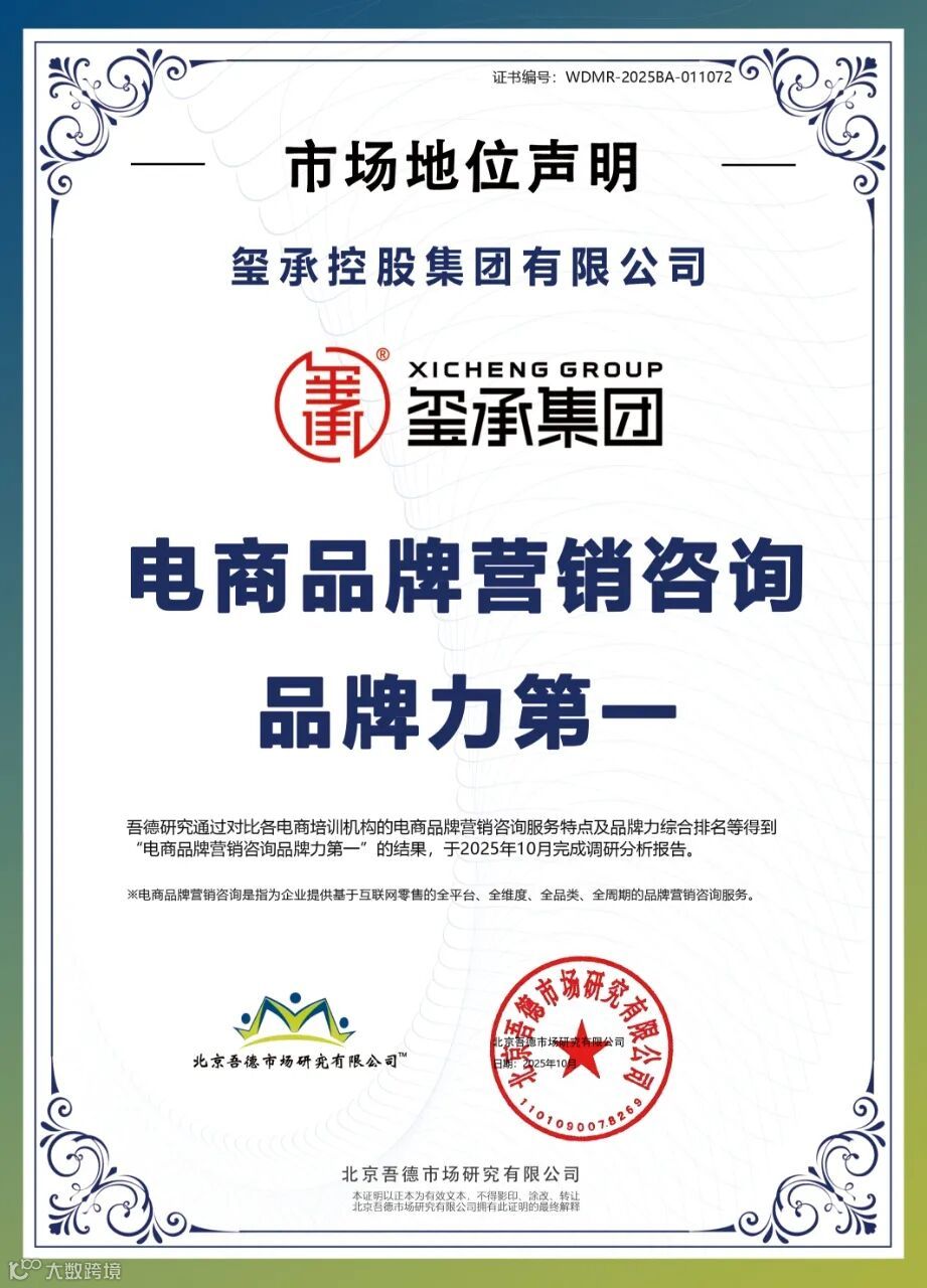 [2]中国电商咨询培训第一品牌 北京吾德市场研究有限公司依据品牌力综合评价体系,以及玺承集团作为电商咨询培训机构的独特业务模式、相关荣誉奖项等综合得到“中国电商咨询培训第一品牌”的结果,于2025年6月完成调研分析报告。