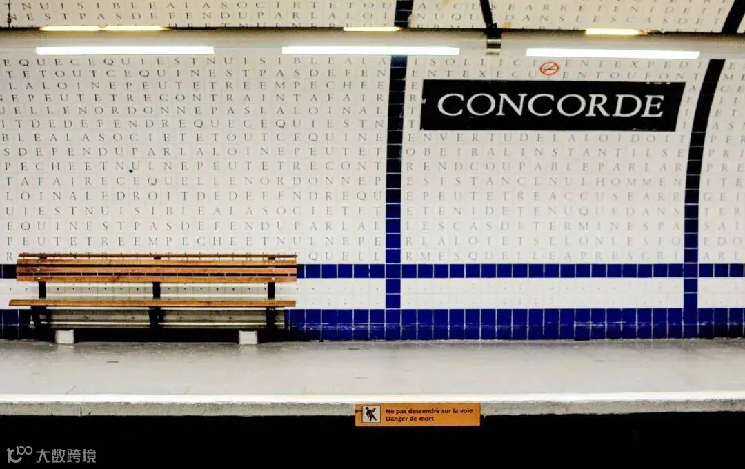 用看似杂乱无章实际上能拼出来人权宣言的字母镶满墙壁的协和广场站(Concorde);