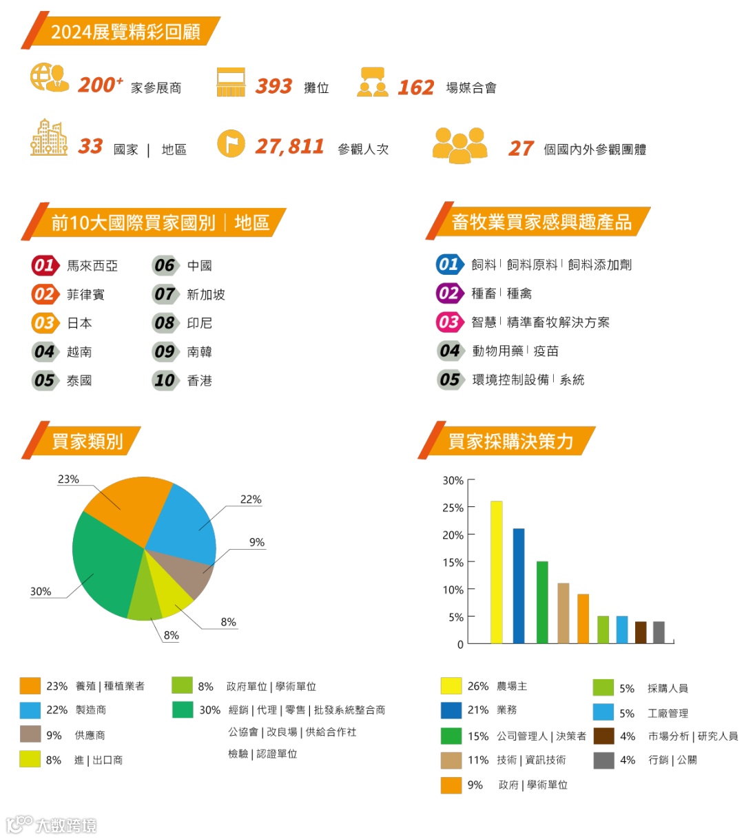 由全球最大的国际专业展览主办单位英富曼集团台湾公司主办、农业部协办的第九届「台湾畜牧产业展」与「台湾养殖渔业展」,同期展出「亚太区农业技术展览暨会议」,以「永续」、「创新」、「食安」为核心理念,展示全球顶尖创新技术、解决方案和设备产品,提供国内外参展厂商及专业买家最佳交流平台,2024 年有来自全球 13 个国家和地区的 200 多家展商共聚于此,同时透过研讨会分享最新产业趋势,推动台湾畜牧产业及养殖渔业技术迈向国际!