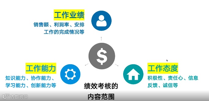 吕霞老师是从工作业绩、工作能力和工作态度这三个维度进行考核的。如下图所示: