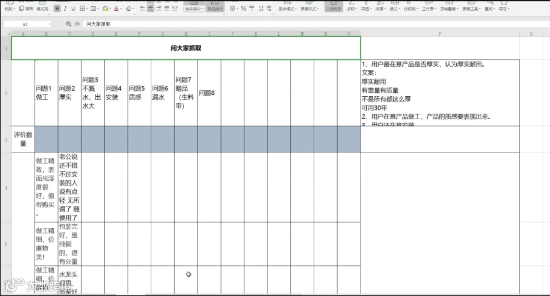 针对评价和问大家,我们先把买家的需求点一个一个做总结归纳,然后把这些评价复制到对应的这一列。