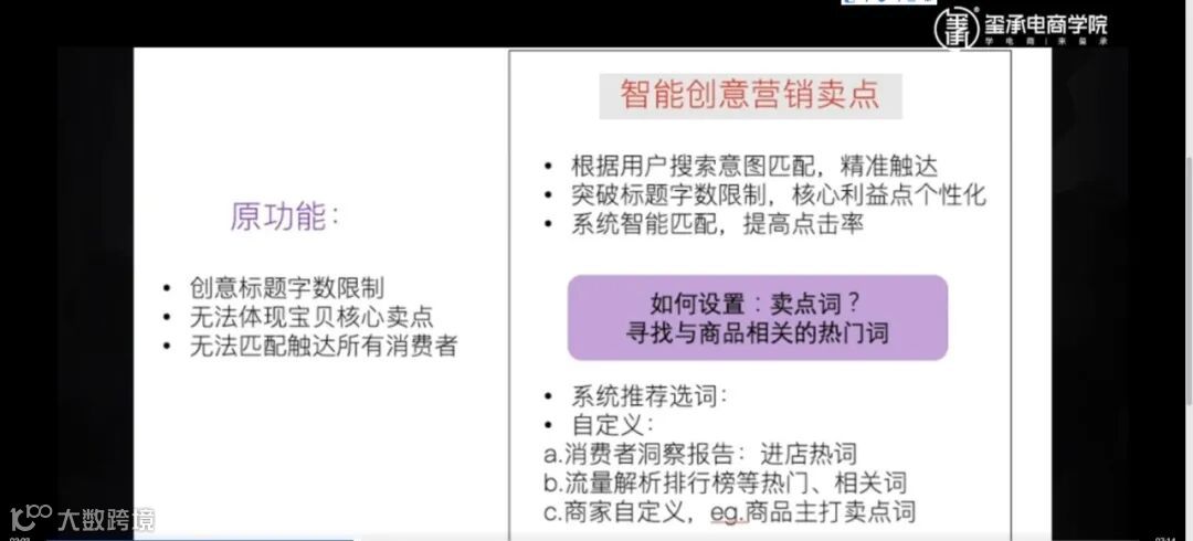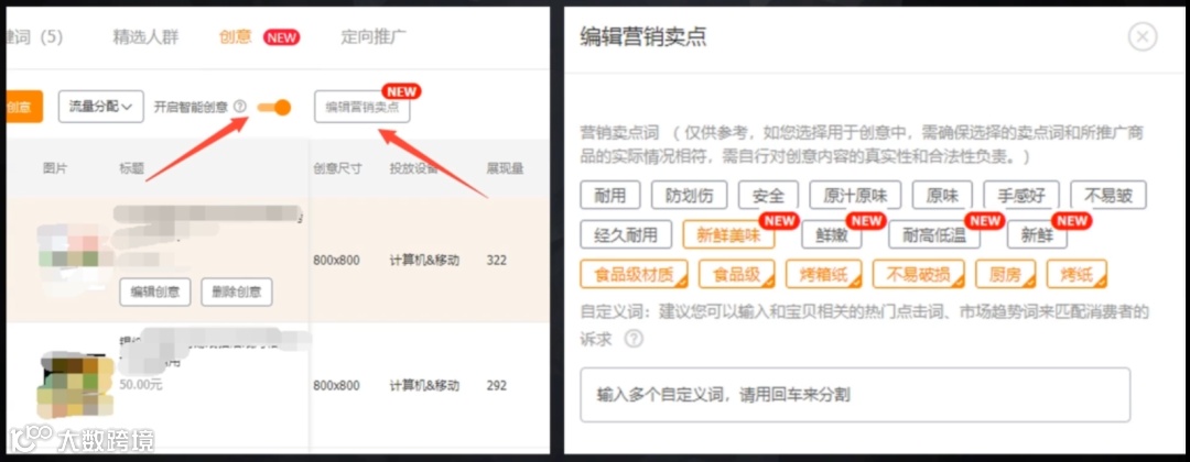 也就是说,营销卖点是基于消费者运营的创意解决方案。营销卖点包含两个部分:系统推荐选词和自定义词。