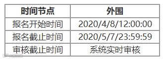 活动正式开始前2小时和活动正式开始2小时内(2020/5/4 22:00:00-2020/5/5 01:59:59)暂停外围报名。