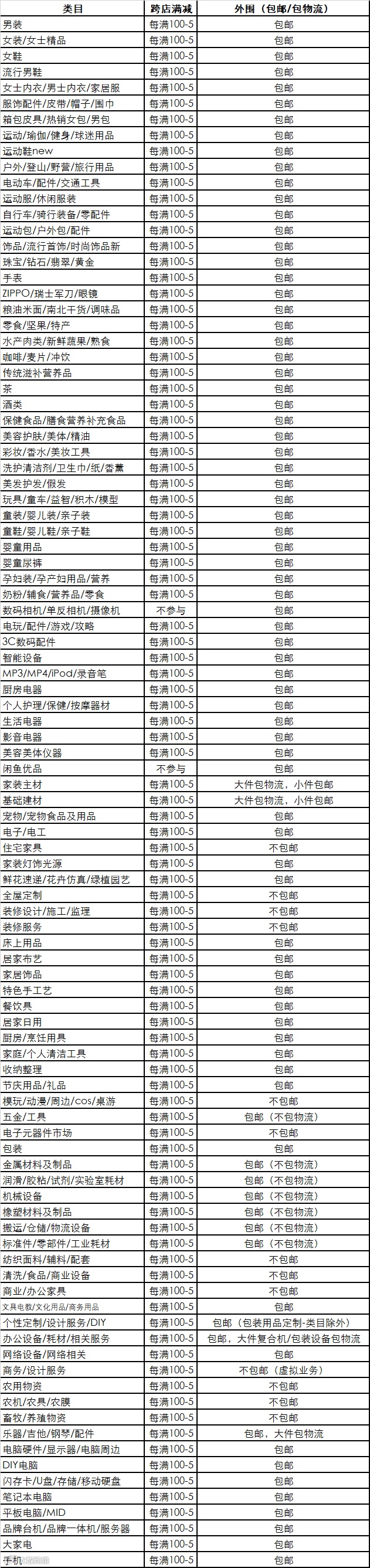 设置了跨店满减的卖家全店商品都支持抵扣,同满减档位的跨店铺商品也都支持抵扣(虚拟、生活服务等类目商品及其他特殊交易定制商品除外);跨店满减只支持商品价格费用抵扣,运费、服务费等其他非商品价格费用不在跨店满减抵扣范围内。