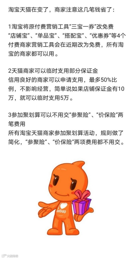 昨日,有消息称, “店铺宝”“单品宝”“搭配宝”“优惠券”4个付费商家营销工具(简称“三宝一券”)将在近期改为免费,该变化适用于淘宝上所有商家。这意味着,商家在淘宝上的经营成本进一步降低。