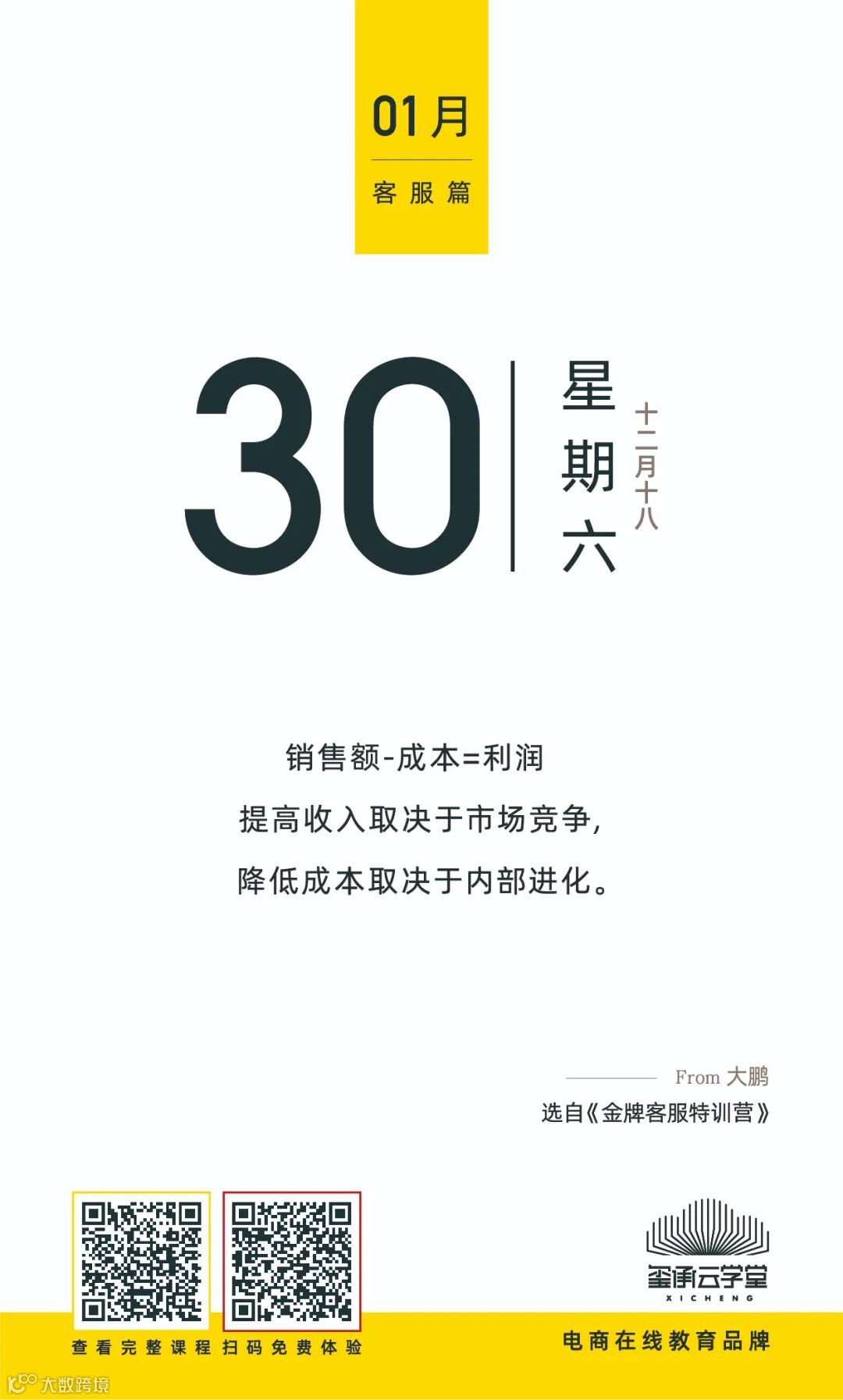 今天的《2021电商思维日历》,告诉你答案。今天的电商思维日历金句,来自大鹏老师的《金牌客服特训营》。