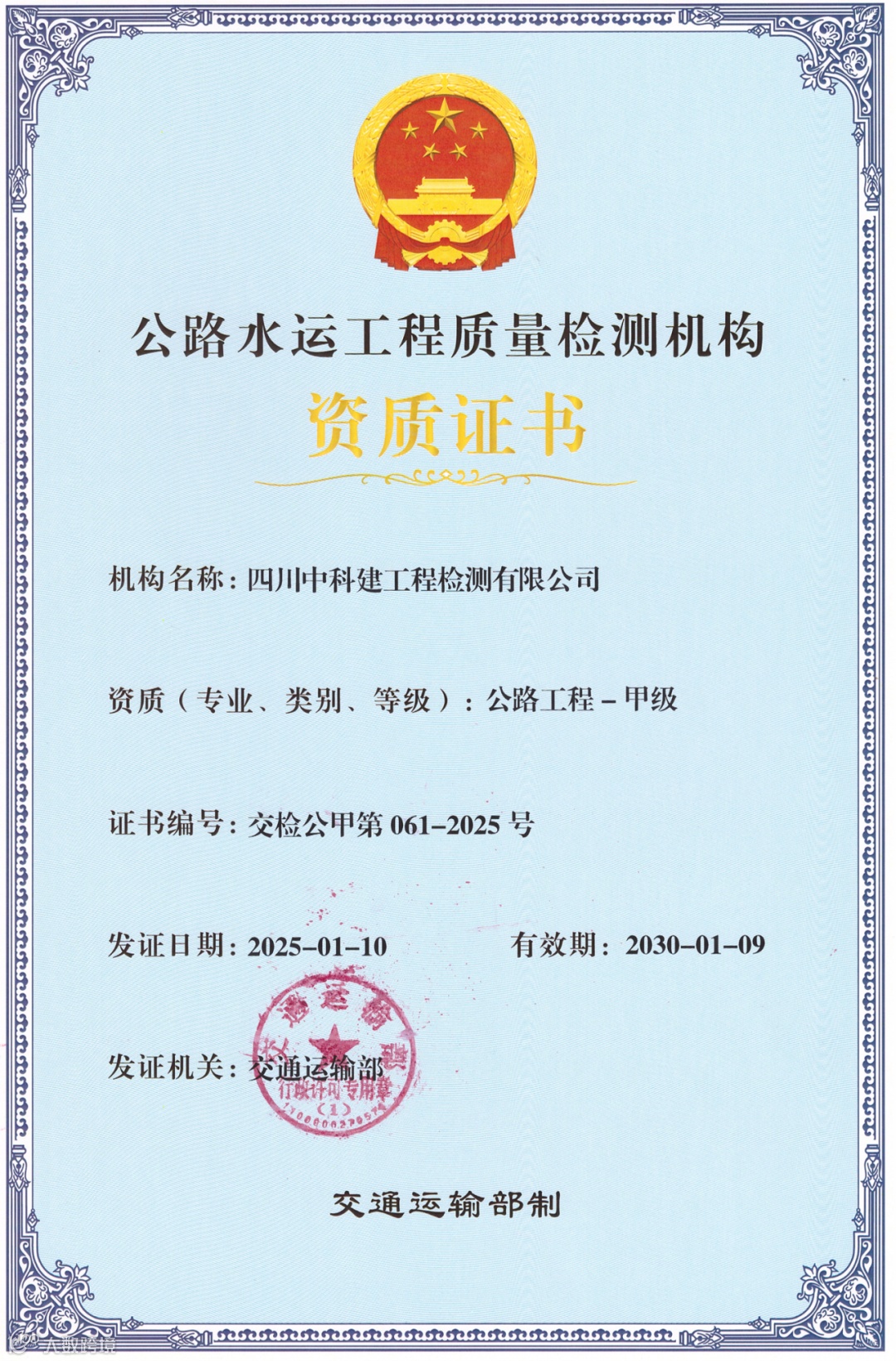 近日,经交通运输部核准,四川中科建工程检测有限公司获批公路工程甲级资质,标志着中科建公司成功迈入公路工程检测领域高梯队方阵,综合实力再攀新高,实现质的飞跃。