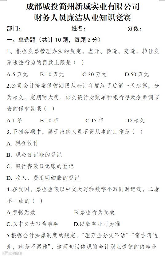 城投简州公司根据相关财经法规和公司财务管理制度,精心设计廉洁从业知识竞赛试题,财务管理部全体财务人员参与答题。通过广泛答题,财务人员加深了对资金安全管控要点的掌握,廉洁自律和遵纪守法意识得到进一步提高。