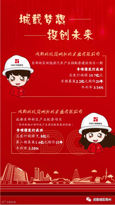 2021年10月28日、2021年11月9日,城投简州公司通过四川省财政厅分两批次成功发行成都东部新区产业配套项目(简州新城云创科技产业园及配套基础设施)及东部新区新能源汽车产业园配套建设项目一期专项债。